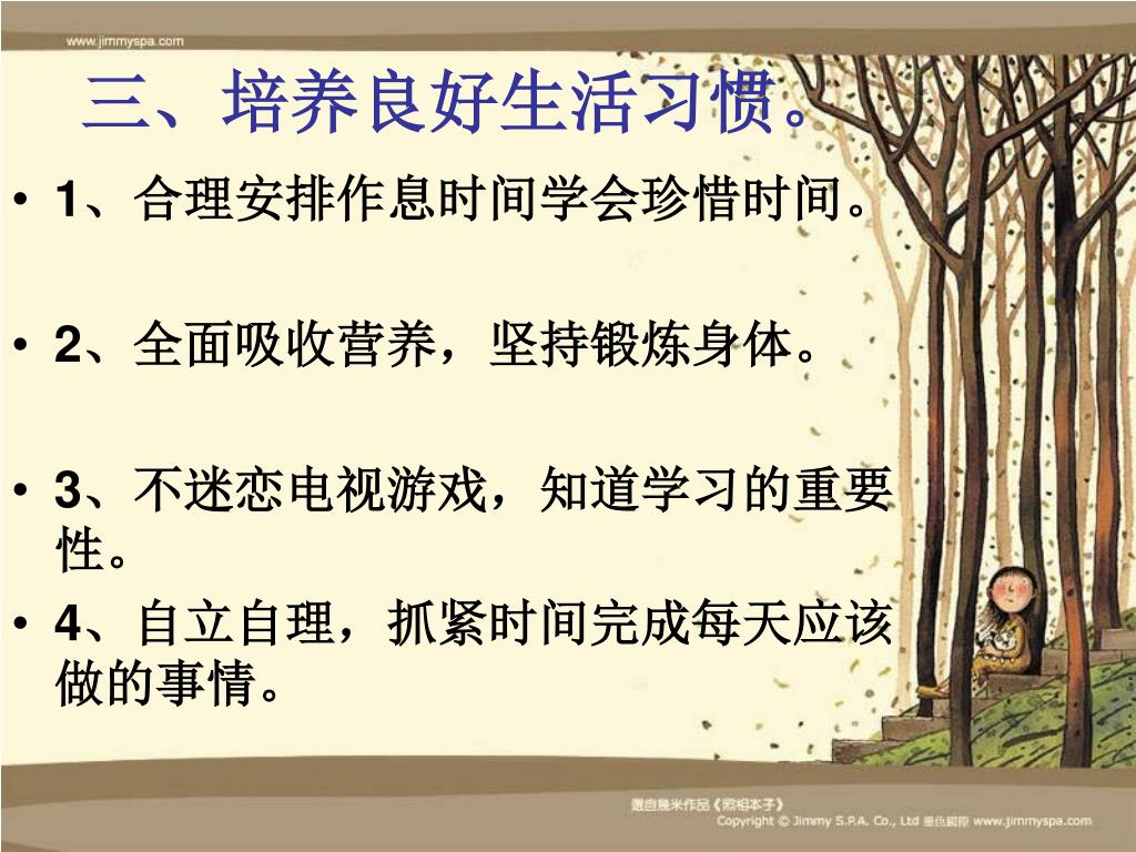 三、培养良好生活习惯。 • 1、合理安排作息时间学会珍惜时间。 • 2、全面吸收营养,坚持锻炼身体。 • 3、不迷恋电视游戏,知道学习的重要性。 • 4、自立自理,抓紧时间完成每天应该做的事情。