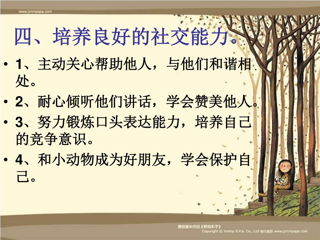 四、培养良好的社交能力。 • 1、主动关心帮助他人,与他们和谐相处。 • 2、耐心倾听他们讲话,学会赞美他人。 • 3、努力锻炼口头表达能力,培养自己的竞争意识。 • 4、和小动物成为好朋友,学会保护自己。