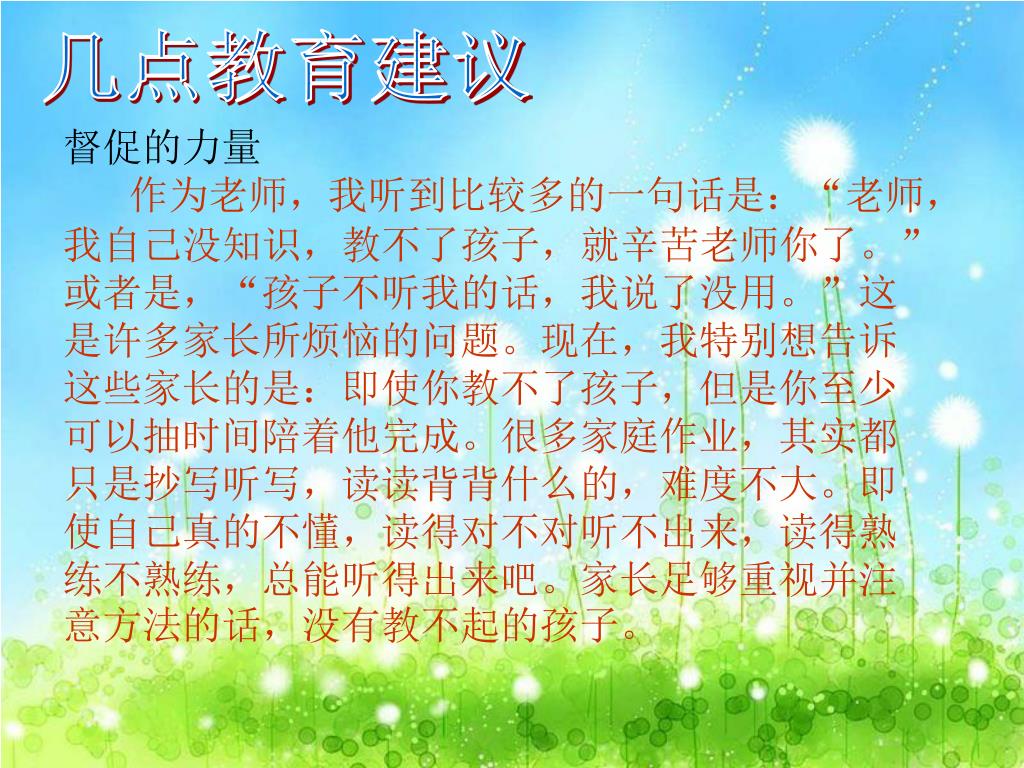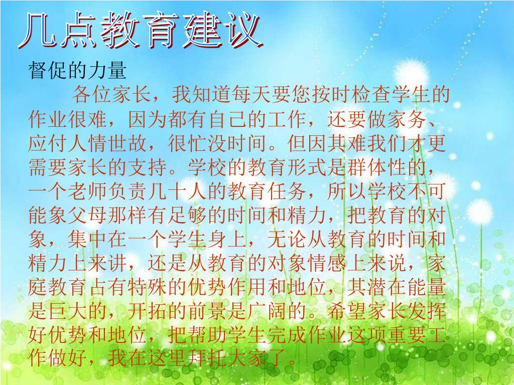 几点教育建议 督促的力量各位家长,我知道每天要您按时检查学生的作业很难,因为都有自己的工作,还要做家务、应付人情世故,很忙没时间。但因其难我们才更需要家长的支持。学校的教育形式是群体性的,一个老师负责几十人的教育任务,所以学校不可能象父母那样有足够的时间和精力,把教育的对象,集中在一个学生身上,无论从教育的时间和精力上来讲,还是从教育的对象情感上来说,家庭教育占有特殊的优势作用和地位,其潜在能量是巨大的,开拓的前景是广阔的。希望家长发挥好优势和地位,把帮助学生完成作业这项重要工作做好,我在这里拜托大家了。