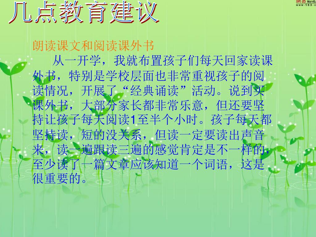 几点教育建议 朗读课文和阅读课外书 从一开学,我就布置孩子们每天回家读课外书,特别是学校层面也非常重视孩子的阅读情况,开展了“经典诵读”活动。说到买课外书,大部分家长都非常乐意,但还要坚持让孩子每天阅读1至半个小时。孩子每天都坚持读,短的没关系,但读一定要读出声音来,读一遍跟读三遍的感觉肯定是不一样的,至少读了一篇文章应该知道一个词语,这是很重要的。