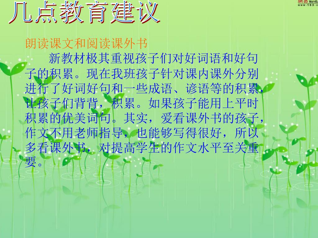 几点教育建议 朗读课文和阅读课外书 新教材极其重视孩子们对好词语和好句子的积累。现在我班孩子针对课内课外分别进行了好词好句和一些成语、谚语等的积累,让孩子们背背,积累。如果孩子能用上平时积累的优美词句。其实,爱看课外书的孩子,作文不用老师指导,也能够写得很好,所以多看课外书,对提高学生的作文水平至关重要。