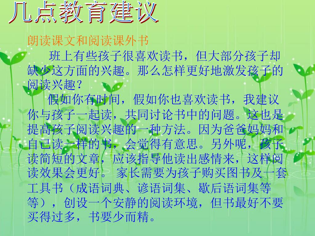 几点教育建议 朗读课文和阅读课外书 班上有些孩子很喜欢读书,但大部分孩子却缺少这方面的兴趣。那么怎样更好地激发孩子的阅读兴趣? 假如你有时间,假如你也喜欢读书,我建议你与孩子一起读,共同讨论书中的问题。这也是提高孩子阅读兴趣的一种方法。因为爸爸妈妈和自己读一样的书,会觉得有意思。另外呢,孩子读简短的文章,应该指导他读出感情来,这样阅读效果会更好。 家长需要为孩子购买图书及一套工具书(成语词典、谚语词集、歇后语词集等等),创设一个安静的阅读环境,但书最好不要买得过多,书要少而精。