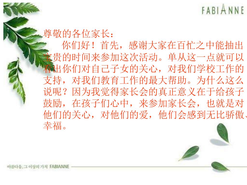各位家长. 欢迎您的到来. 尊敬的各位家长: 你们好!首先,感谢大家在百忙之中能抽出宝贵的时间来参加这次活动。单从这一点就可以看出你们对自己子女的关心,对我们学校工作的支持,对我们教育工作的最大帮助。为什么这么说呢?因为我觉得家长会的真正意义在于给孩子鼓励,在孩子们心中,来参加家长会,也就是对他们的关心,对他们的爱,他们会感到无比骄傲、幸福。. 这次家长会是经学校研究决定召开的,目的是架起老师与家长间沟通的桥梁,你们的到来,也说明了在“只有形成教育合力,才能更好地帮助学生进步”上,我们是能够达成共识的。今天的会议有四项议程,