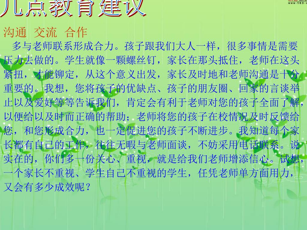 几点教育建议 沟通 交流 合作 多与老师联系形成合力。孩子跟我们大人一样,很多事情是需要压力去做的。学生就像一颗螺丝钉,家长在那头抵住,老师在这头紧扭,才能铆定,从这个意义出发,家长及时地和老师沟通是十分重要的。我想,您将孩子的优缺点、孩子的朋友圈、回家的言谈举止以及爱好等等告诉我们,肯定会有利于老师对您的孩子全面了解,以便给以及时而正确的帮助;老师将您的孩子在校情况及时反馈给您,和您形成合力,也一定促进您的孩子不断进步。我知道每个家长都有自己的工作,往往无暇与老师面谈,不妨采用电话联系。说实在的,你们多一份关心、重视,就是给我们老师增添信心。试想,一个家长不重视、学生自己不重视的学生,任凭老师单方面用力,又会有多少成效呢?