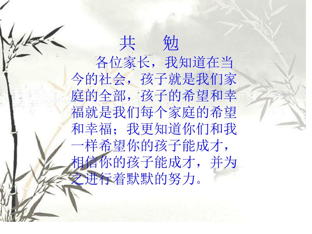 共 勉 各位家长,我知道在当今的社会,孩子就是我们家庭的全部,孩子的希望和幸福就是我们每个家庭的希望和幸福;我更知道你们和我一样希望你的孩子能成才,相信你的孩子能成才,并为之进行着默默的努力。