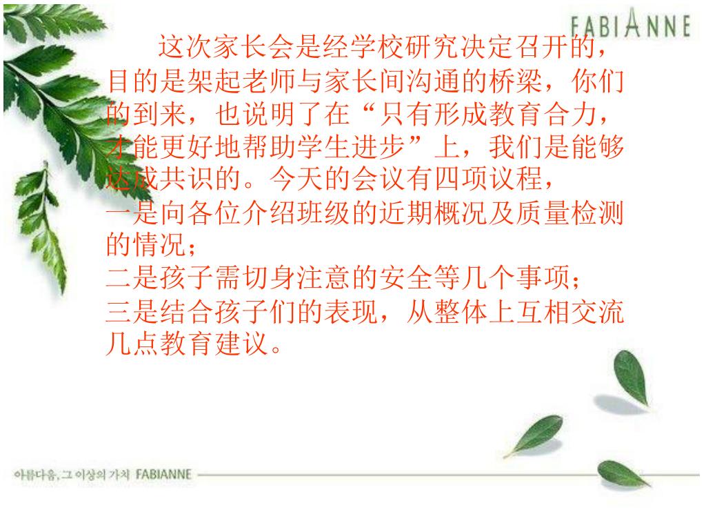 这次家长会是经学校研究决定召开的,目的是架起老师与家长间沟通的桥梁,你们的到来,也说明了在“只有形成教育合力,才能更好地帮助学生进步”上,我们是能够达成共识的。今天的会议有四项议程, 一是向各位介绍班级的近期概况及质量检测的情况; 二是孩子需切身注意的安全等几个事项; 三是结合孩子们的表现,从整体上互相交流几点教育建议。