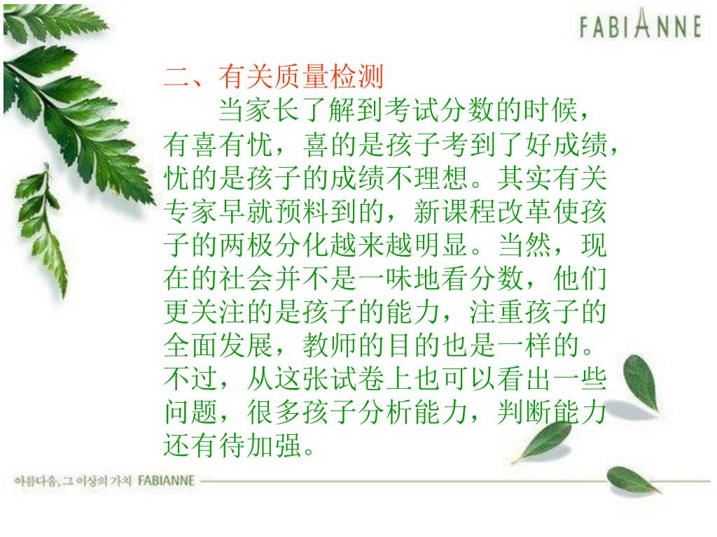 二、有关质量检测 当家长了解到考试分数的时候,有喜有忧,喜的是孩子考到了好成绩,忧的是孩子的成绩不理想。其实有关专家早就预料到的,新课程改革使孩子的两极分化越来越明显。当然,现在的社会并不是一味地看分数,他们更关注的是孩子的能力,注重孩子的全面发展,教师的目的也是一样的。不过,从这张试卷上也可以看出一些问题,很多孩子分析能力,判断能力还有待加强。