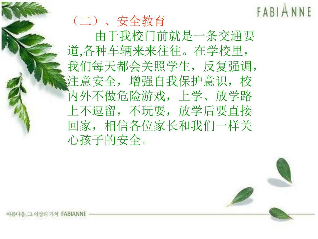 (二)、安全教育 由于我校门前就是一条交通要道,各种车辆来来往往。在学校里,我们每天都会关照学生,反复强调,注意安全,增强自我保护意识,校内外不做危险游戏,上学、放学路上不逗留,不玩耍,放学后要直接回家,相信各位家长和我们一样关心孩子的安全。