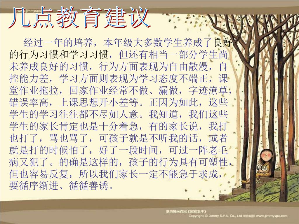 几点教育建议 经过一年的培养,本年级大多数学生养成了良好的行为习惯和学习习惯,但还有相当一部分学生尚未养成良好的习惯,行为方面表现为自由散漫,自控能力差,学习方面则表现为学习态度不端正,课堂作业拖拉,回家作业经常不做、漏做,字迹潦草,错误率高,上课思想开小差等。正因为如此,这些学生的学习往往都不尽如人意。我知道,我们这些学生的家长肯定也是十分着急,有的家长说,我打也打了,骂也骂了,可孩子就是不听我的话,或者就是打的时候怕了,好了一段时间,可过一阵老毛病又犯了。的确是这样的,孩子的行为具有可塑性,但也容易反复,所以我们家长一定不能急于求成,要循序渐进、循循善诱。