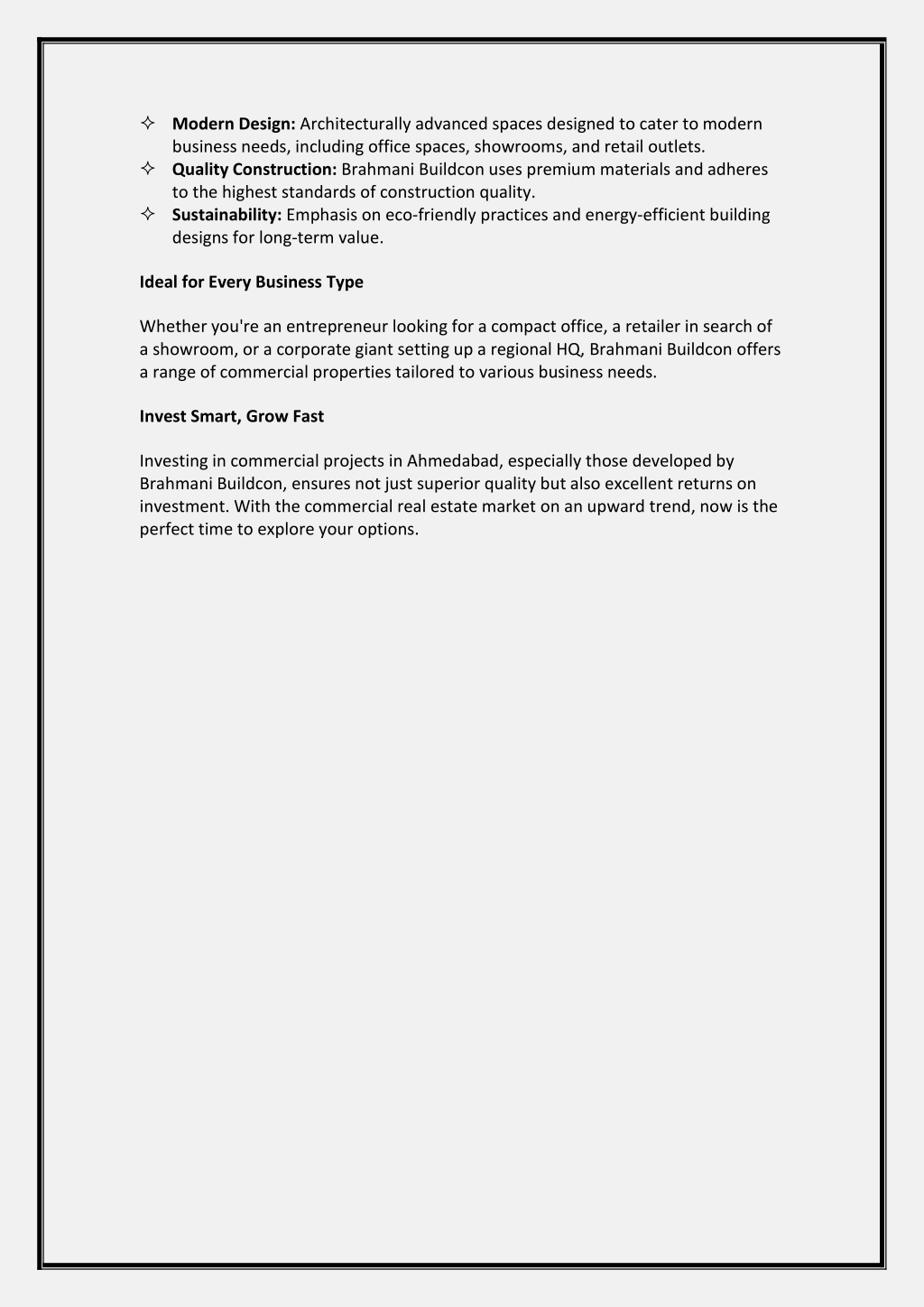 Modern Design: Architecturally advanced spaces designed to cater to modern business needs, including office spaces, showrooms, and retail outlets. Quality Construction: Brahmani Buildcon uses premium materials and adheres to the highest standards of construction quality. Sustainability: Emphasis on eco-friendly practices and energy-efficient building designs for long-term value. Ideal for Every Business Type Whether you're an entrepreneur looking for a compact office, a retailer in search of a showroom, or a corporate giant setting up a regional HQ, Brahmani Buildcon offers a range of commercial properties tailored to various business needs. Invest Smart, Grow Fast Investing in commercial projects in Ahmedabad, especially those developed by Brahmani Buildcon, ensures not just superior quality but also excellent returns on investment. With the commercial real estate market on an upward trend, now is the perfect time to explore your options.