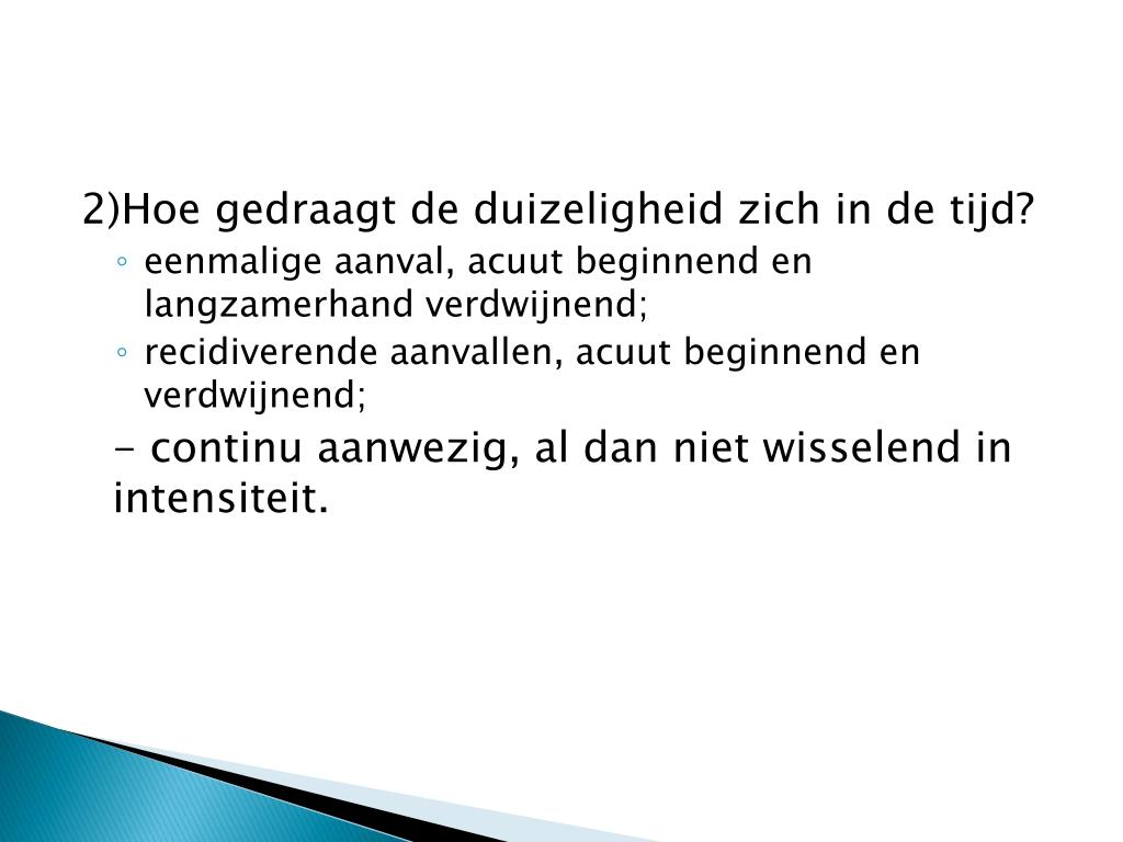 2)Hoe gedraagt de duizeligheid zich in de tijd? • eenmalige aanval, acuut beginnend en langzamerhand verdwijnend; • recidiverende aanvallen, acuut beginnend en verdwijnend; - continu aanwezig, al dan niet wisselend in intensiteit.