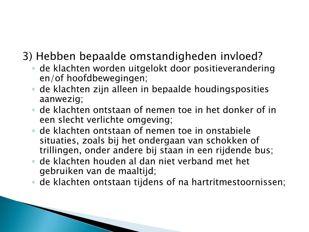 3) Hebben bepaalde omstandigheden invloed? • de klachten worden uitgelokt door positieverandering en/of hoofdbewegingen; • de klachten zijn alleen in bepaalde houdingsposities aanwezig; • de klachten ontstaan of nemen toe in het donker of in een slecht verlichte omgeving; • de klachten ontstaan of nemen toe in onstabiele situaties, zoals bij het ondergaan van schokken of trillingen, onder andere bij staan in een rijdende bus; • de klachten houden al dan niet verband met het gebruiken van de maaltijd; • de klachten ontstaan tijdens of na hartritmestoornissen;
