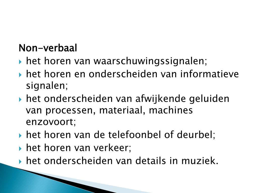 Non-verbaal • het horen van waarschuwingssignalen; • het horen en onderscheiden van informatieve signalen; • het onderscheiden van afwijkende geluiden van processen, materiaal, machines enzovoort; • het horen van de telefoonbel of deurbel; • het horen van verkeer; • het onderscheiden van details in muziek.