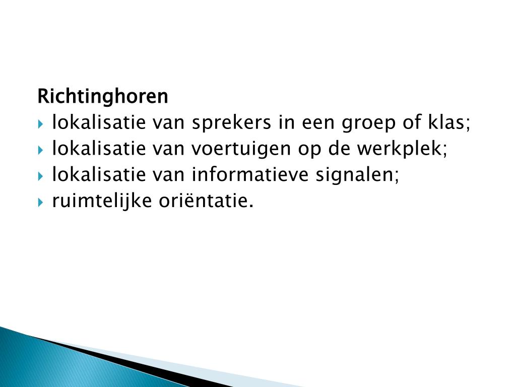 Richtinghoren • lokalisatie van sprekers in een groep of klas; • lokalisatie van voertuigen op de werkplek; • lokalisatie van informatieve signalen; • ruimtelijke oriëntatie.