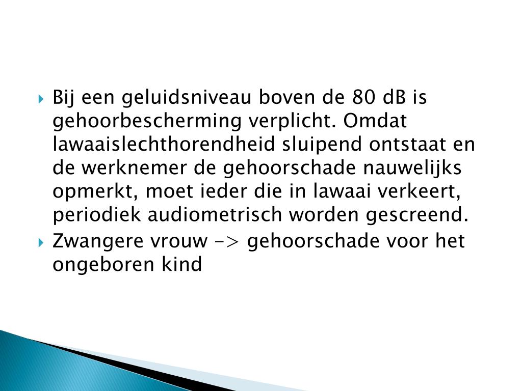 Bij een geluidsniveau boven de 80 dB is gehoorbescherming verplicht. Omdat lawaaislechthorendheid sluipend ontstaat en de werknemer de gehoorschade nauwelijks opmerkt, moet ieder die in lawaai verkeert, periodiek audiometrisch worden gescreend. • Zwangere vrouw -> gehoorschade voor het ongeboren kind