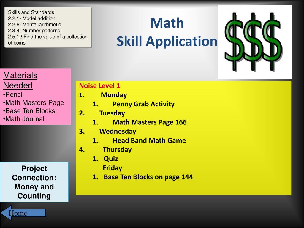 Skills and Standards 2.2.1- Model addition 2.2.6- Mental arithmetic 2.3.4- Number patterns 2.5.12 Find the value of a collection of coins MathSkill Application Noise Level 1 • Monday • Penny Grab Activity • Tuesday • Math Masters Page 166 • Wednesday • Head Band Math Game • Thursday • Quiz Friday • Base Ten Blocks on page 144 • Materials Needed • Pencil • Math Masters Page • Base Ten Blocks • Math Journal Project Connection: Money and Counting Home