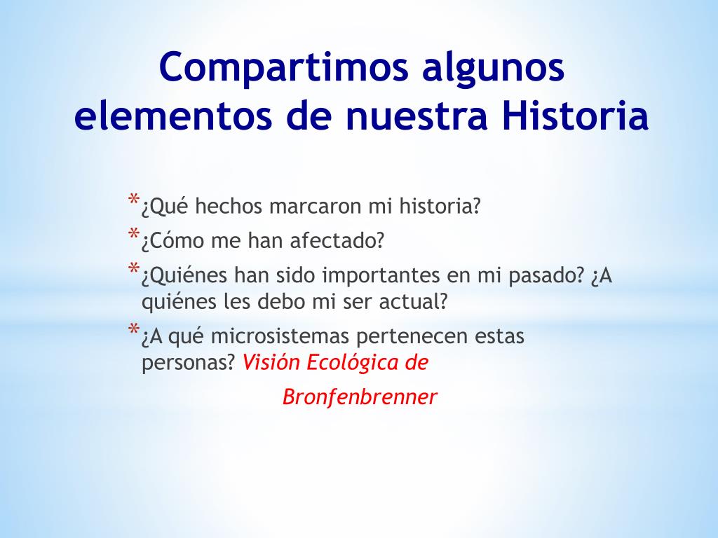 ¿Qué hechosmarcaron mi historia? • ¿Cómo me hanafectado? • ¿Quiéneshansidoimportantes en mi pasado? ¿A quiénes les debo mi ser actual? • ¿A qué microsistemaspertenecen estas personas? VisiónEcológica de Bronfenbrenner Compartimosalgunoselementos de nuestra Historia