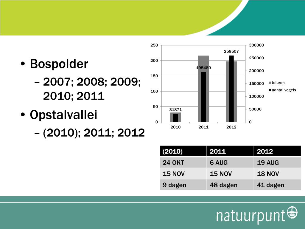 Verslag trektellen OSV 2012. Een Falsterbo aan ‘t Scheld...?. Bospolder 2007; 2008; 2009; 2010; 2011 Opstalvallei (2010); 2011; 2012. Bospolder 2007; 2008; 2009; 2010; 2011 Opstalvallei (2010); 2011; 2012. Bospolder 2007; 2008; 2009; 2010; 2011 Opstalvallei (2010); 2011; 2012.
