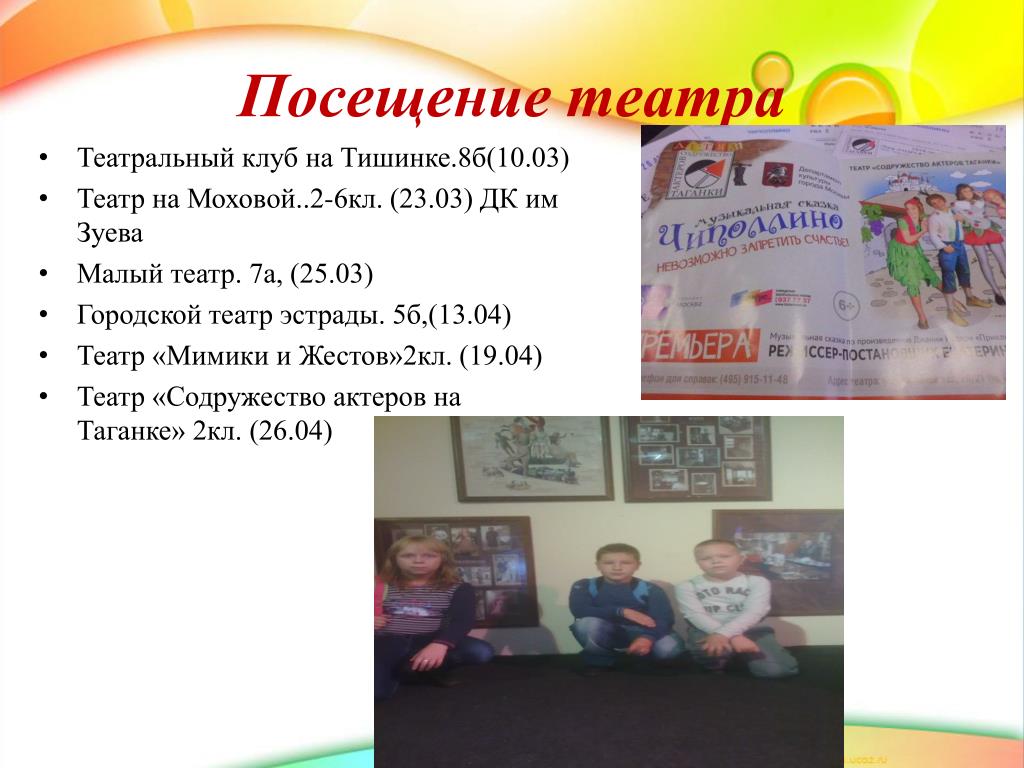 Посещение театра • Театральный клуб на Тишинке.8б(10.03) • Театр на Моховой..2-6кл. (23.03) ДК им Зуева • Малый театр. 7а, (25.03) • Городской театр эстрады. 5б,(13.04) • Театр «Мимики и Жестов»2кл. (19.04) • Театр «Содружество актеров на Таганке» 2кл. (26.04)