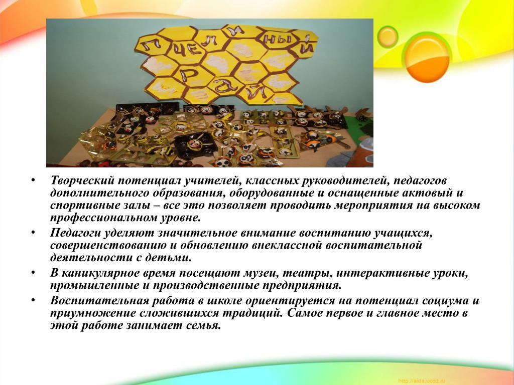 Творческий потенциал учителей, классных руководителей, педагогов дополнительного образования, оборудованные и оснащенные актовый и спортивные залы – все это позволяет проводить мероприятия на высоком профессиональном уровне. • Педагоги уделяют значительное внимание воспитанию учащихся, совершенствованию и обновлению внеклассной воспитательной деятельности с детьми. • В каникулярное время посещают музеи, театры, интерактивные уроки, промышленные и производственные предприятия. • Воспитательная работа в школе ориентируется на потенциал социума и приумножение сложившихся традиций. Самое первое и главное место в этой работе занимает семья.