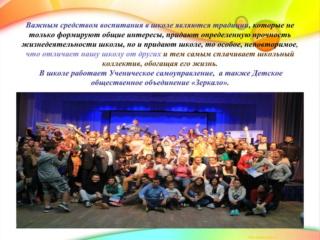 Важным средством воспитания в школе являются традиции, которые не только формируют общие интересы, придают определенную прочность жизнедеятельности школы, но и придают школе, то особое, неповторимое, что отличает нашу школу от других и тем самым сплачивает школьный коллектив, обогащая его жизнь.В школе работает Ученическое самоуправление, а также Детское общественное объединение «Зеркало».