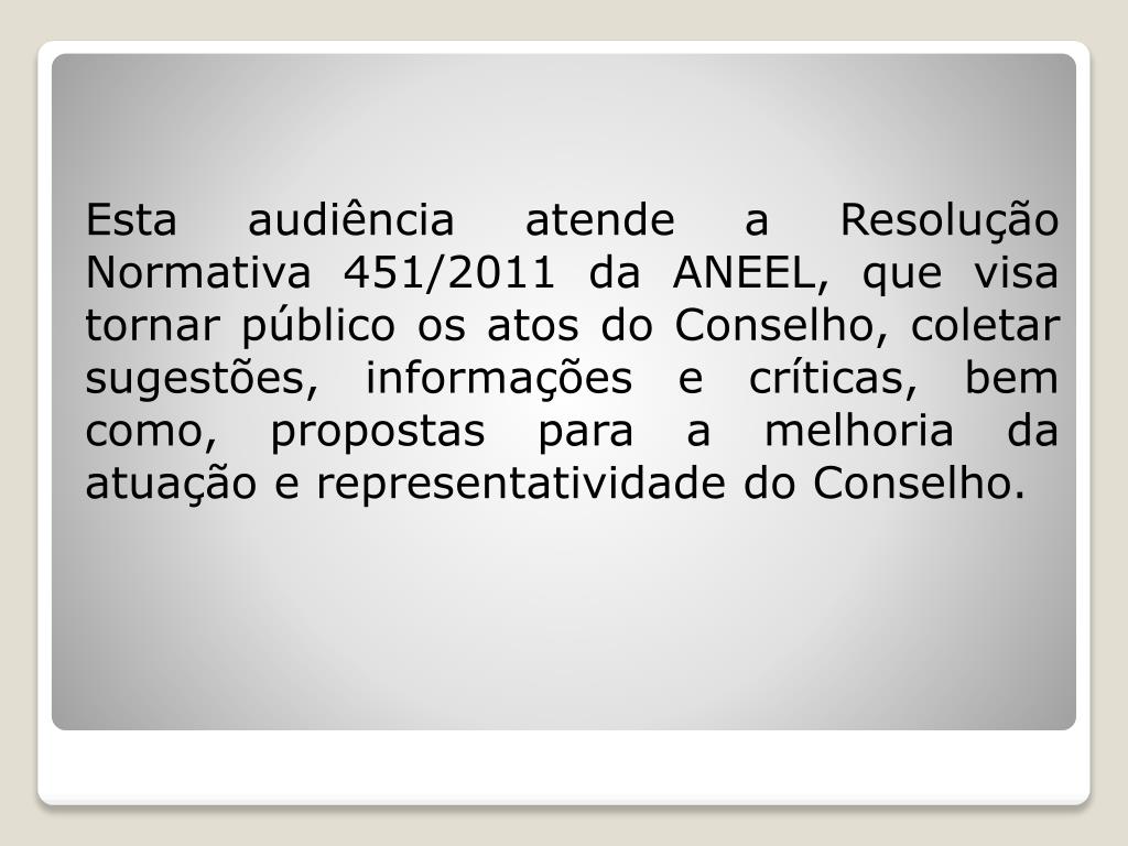 Esta audiência atende a Resolução Normativa 451/2011 da ANEEL, que visa tornar público os atos do Conselho, coletar sugestões, informações e críticas, bem como, propostas para a melhoria da atuação e representatividade do Conselho.