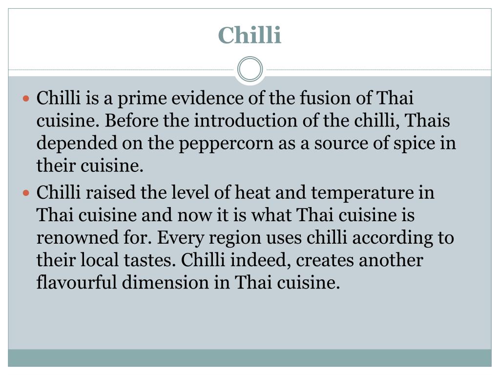 Chilli • Chilli is a prime evidence of the fusion of Thai cuisine. Before the introduction of the chilli, Thais depended on the peppercorn as a source of spice in their cuisine. • Chilli raised the level of heat and temperature in Thai cuisine and now it is what Thai cuisine is renowned for. Every region uses chilli according to their local tastes. Chilli indeed, creates another flavourful dimension in Thai cuisine.