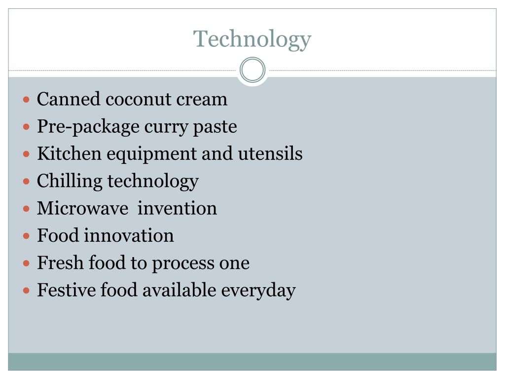 Technology • Canned coconut cream • Pre-package curry paste • Kitchen equipment and utensils • Chilling technology • Microwave invention • Food innovation • Fresh food to process one • Festive food available everyday