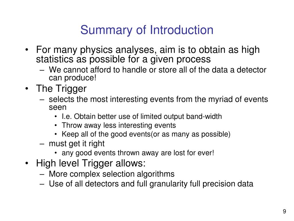 Summary of Introduction • For many physics analyses, aim is to obtain as high statistics as possible for a given process • We cannot afford to handle or store all of the data a detector can produce! • The Trigger • selects the most interesting events from the myriad of events seen • I.e. Obtain better use of limited output band-width • Throw away less interesting events • Keep all of the good events(or as many as possible) • must get it right • any good events thrown away are lost for ever! • High level Trigger allows: • More complex selection algorithms • Use of all detectors and full granularity full precision data