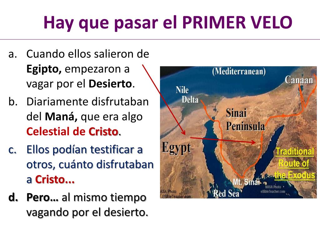 Hay que pasar el PRIMER VELO • Cuando ellos salieron de Egipto, empezaron a vagar por el Desierto. • Diariamente disfrutaban del Maná, que era algo Celestial de Cristo. • Ellos podían testificar a otros, cuánto disfrutaban a Cristo... • Pero… al mismo tiempo vagando por el desierto.