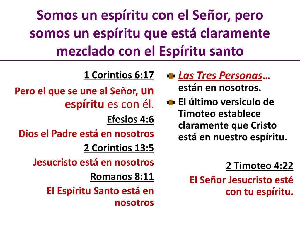 Somos un espíritu con el Señor, pero somos un espíritu que está claramente mezclado con el Espíritu santo 1 Corintios 6:17 Pero el que se une al Señor, un espíritu es con él. Efesios 4:6 Dios el Padre está en nosotros 2 Corintios 13:5 Jesucristo está en nosotros Romanos 8:11 El Espíritu Santo está en nosotros • Las Tres Personas… están en nosotros. • El último versículo de Timoteo establece claramente que Cristo está en nuestro espíritu. 2 Timoteo 4:22 El Señor Jesucristo esté con tu espíritu.