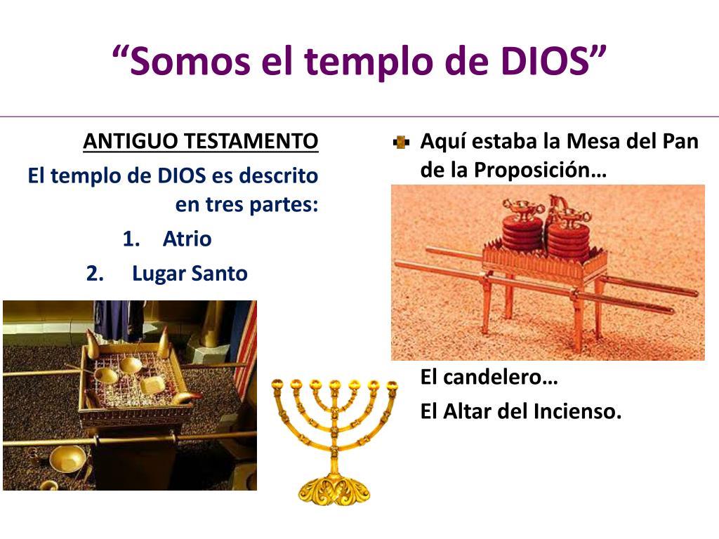 “Somos el templo de DIOS” • Aquí estaba la Mesa del Pan de la Proposición… El candelero… El Altar del Incienso. ANTIGUO TESTAMENTO El templo de DIOS es descrito en tres partes: • Atrio • Lugar Santo
