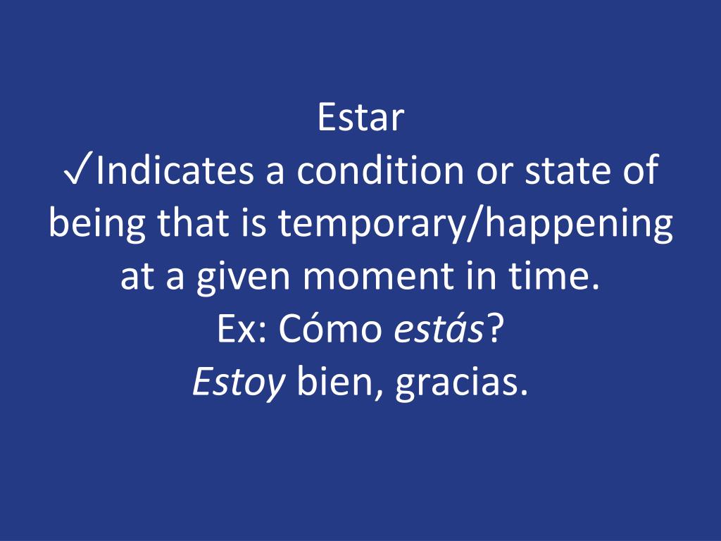 Estar✓Indicates a condition or state of being that is temporary/happening at a given moment in time.Ex: Cómoestás?Estoybien, gracias.