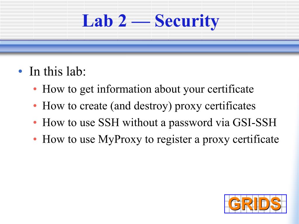 Lab 2 — Security • In this lab: • How to get information about your certificate • How to create (and destroy) proxy certificates • How to use SSH without a password via GSI-SSH • How to use MyProxy to register a proxy certificate