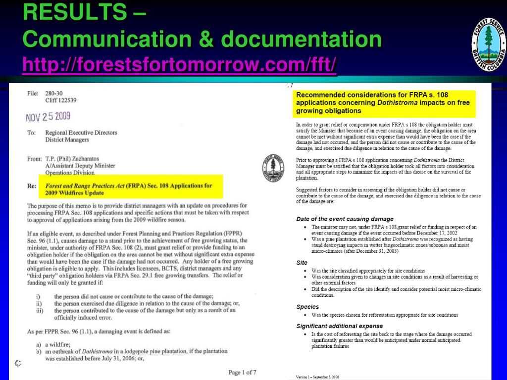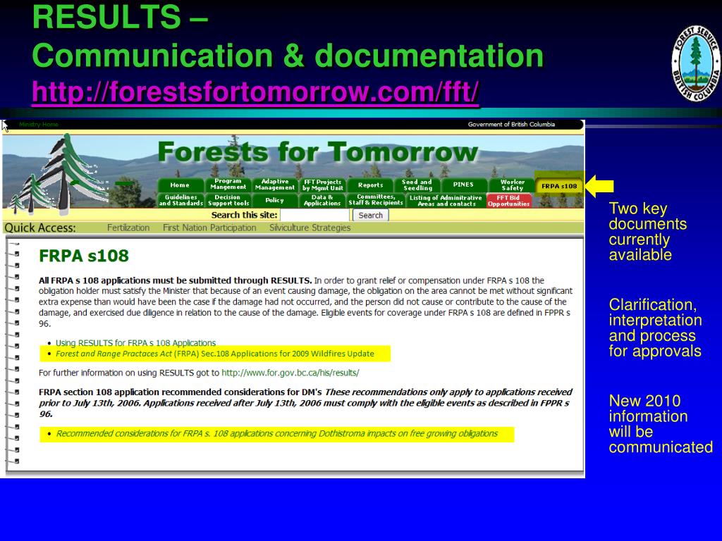 RESULTS – Communication & documentationhttp://forestsfortomorrow.com/fft/ Two key documents currently available Clarification, interpretation and process for approvals New 2010 information will be communicated