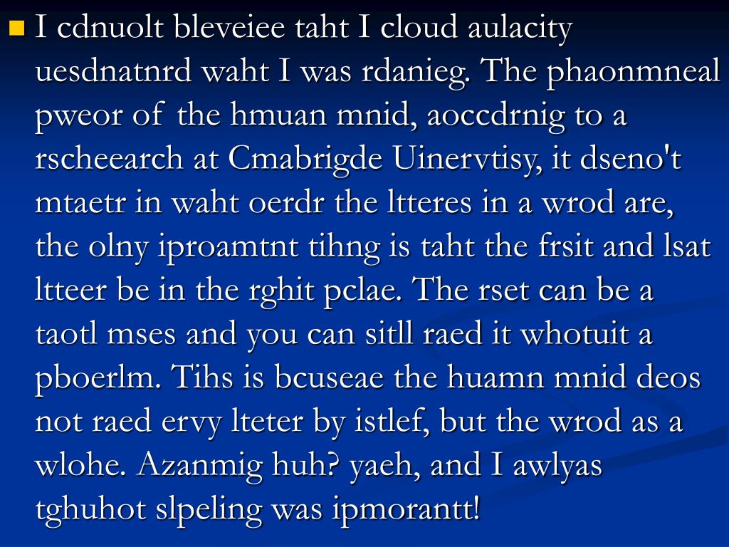 I cdnuolt bleveiee taht I cloud aulacity uesdnatnrd waht I was rdanieg. The phaonmneal pweor of the hmuan mnid, aoccdrnig to a rscheearch at Cmabrigde Uinervtisy, it dseno't mtaetr in waht oerdr the ltteres in a wrod are, the olny iproamtnt tihng is taht the frsit and lsat ltteer be in the rghit pclae. The rset can be a taotl mses and you can sitll raed it whotuit a pboerlm. Tihs is bcuseae the huamn mnid deos not raed ervy lteter by istlef, but the wrod as a wlohe. Azanmig huh? yaeh, and I awlyas tghuhot slpeling was ipmorantt!