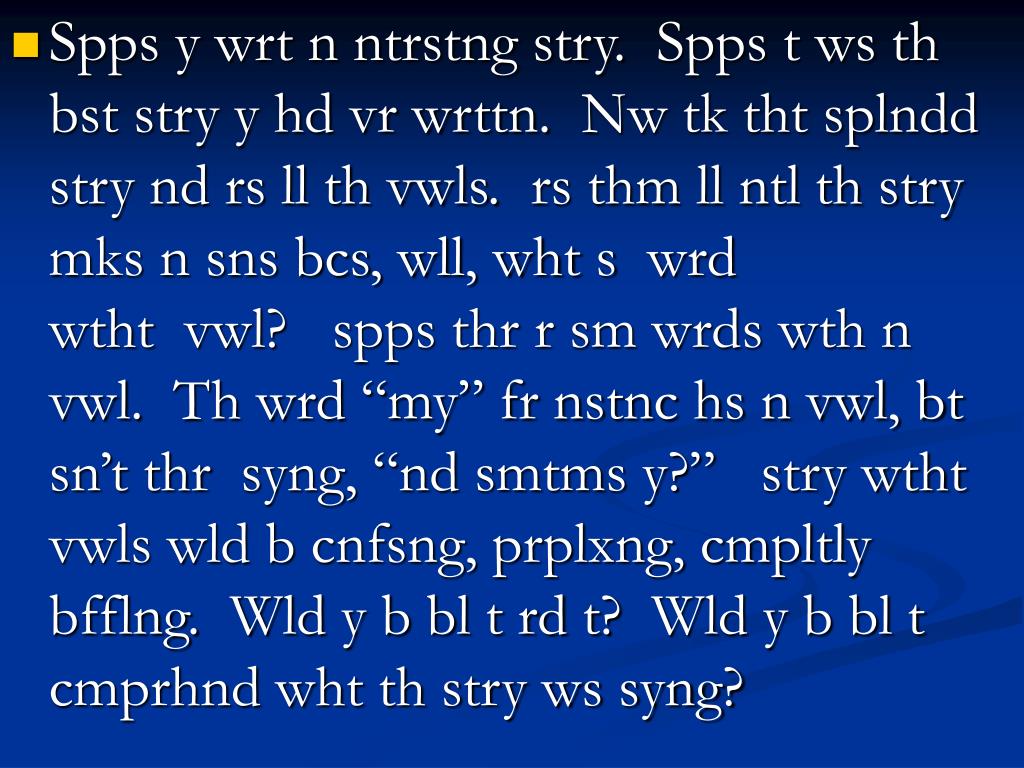 Spps y wrt n ntrstng stry. Spps t ws th bst stry y hd vr wrttn. Nw tk tht splndd stry nd rs ll th vwls. rs thm ll ntl th stry mks n sns bcs, wll, wht s wrd wtht vwl? spps thr r sm wrds wth n vwl. Th wrd “my” fr nstnc hs n vwl, bt sn’t thr syng, “nd smtms y?” stry wtht vwls wld b cnfsng, prplxng, cmpltly bfflng. Wld y b bl t rd t? Wld y b bl t cmprhnd wht th stry ws syng?