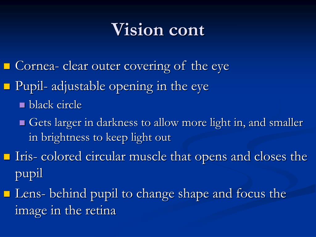 Vision cont • Cornea- clear outer covering of the eye • Pupil- adjustable opening in the eye • black circle • Gets larger in darkness to allow more light in, and smaller in brightness to keep light out • Iris- colored circular muscle that opens and closes the pupil • Lens- behind pupil to change shape and focus the image in the retina