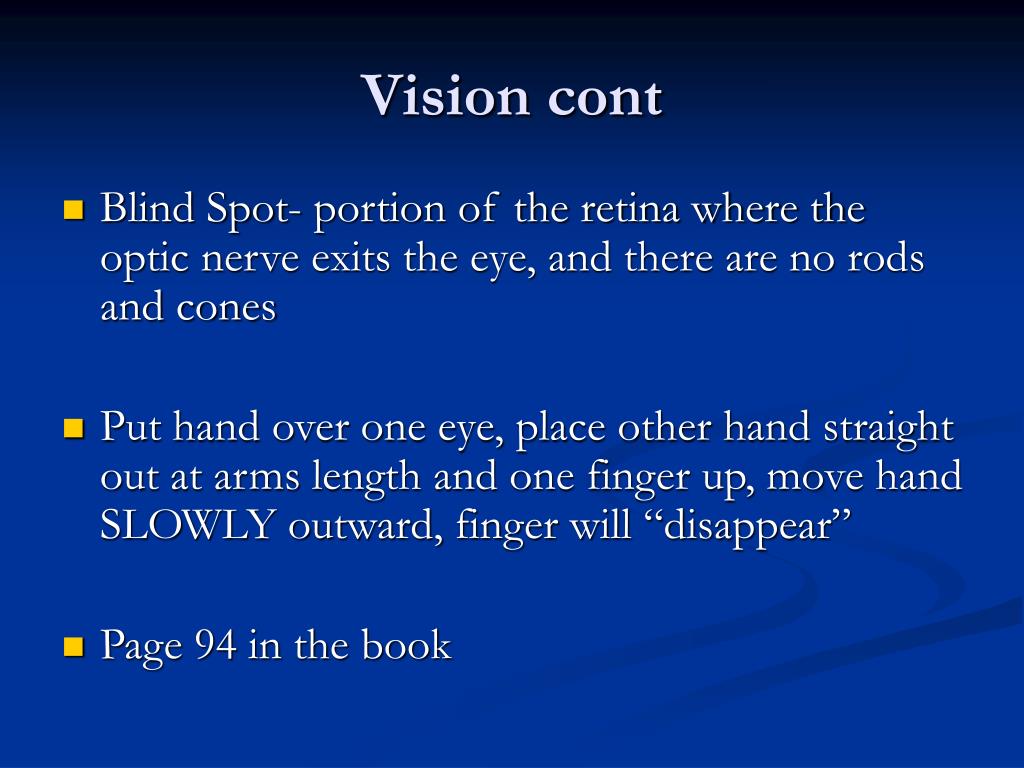 Vision cont • Blind Spot- portion of the retina where the optic nerve exits the eye, and there are no rods and cones • Put hand over one eye, place other hand straight out at arms length and one finger up, move hand SLOWLY outward, finger will “disappear” • Page 94 in the book