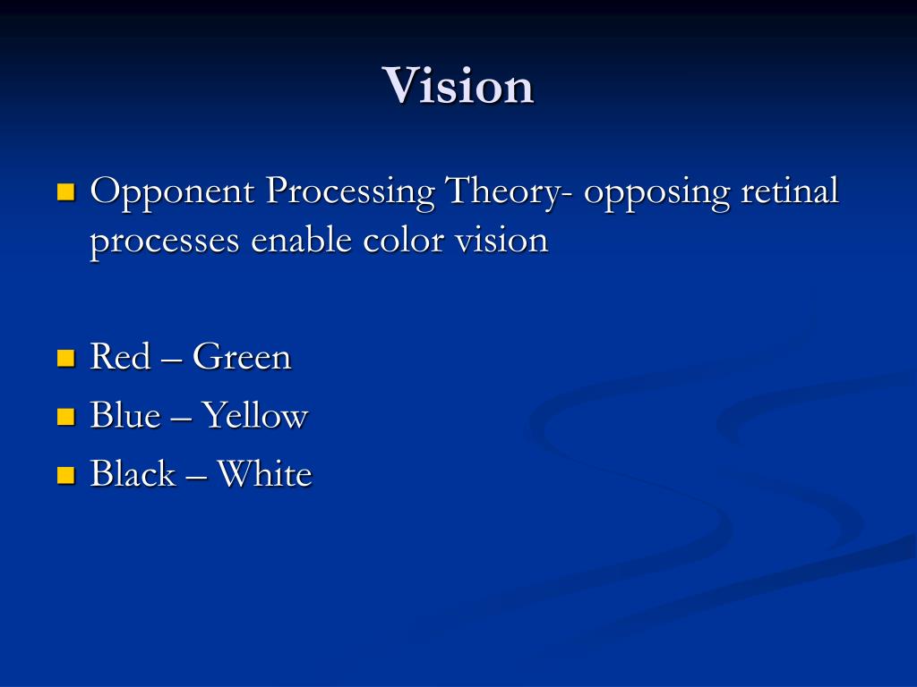 Vision • Opponent Processing Theory- opposing retinal processes enable color vision • Red – Green • Blue – Yellow • Black – White