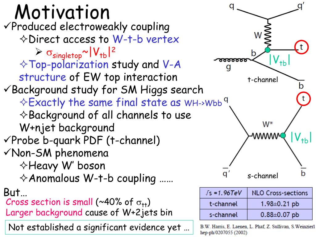 Motivation |Vtb| |Vtb| • Produced electroweakly coupling • Direct access to W-t-b vertex • ssingletop~|Vtb|2 • Top-polarization study and V-A structure of EW top interaction • Background study for SM Higgs search • Exactly the same final state as WH->Wbb • Background of all channels to use W+njet background • Probe b-quark PDF (t-channel) • Non-SM phenomena • Heavy W’ boson • Anomalous W-t-b coupling …… t-channel s-channel But… Cross section is small (~40% of stt) Larger background cause of W+2jets bin Not established a significant evidence yet …