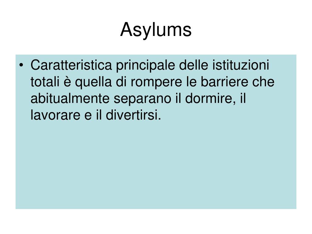Asylums • Caratteristica principale delle istituzioni totali è quella di rompere le barriere che abitualmente separano il dormire, il lavorare e il divertirsi.