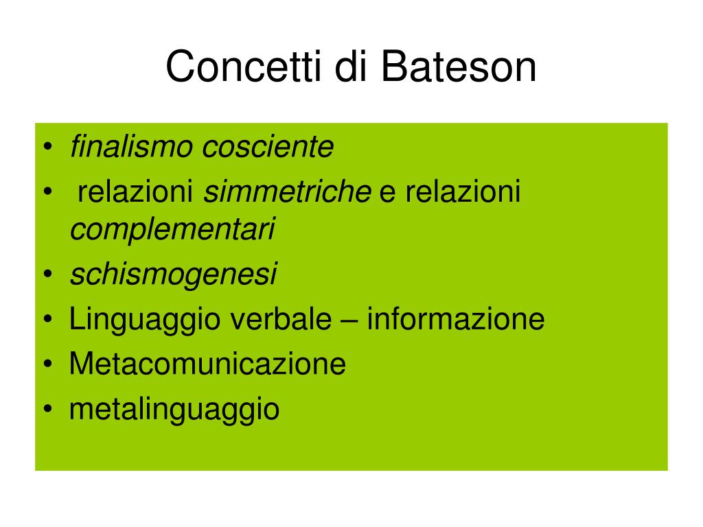 Concetti di Bateson • finalismo cosciente • relazioni simmetriche e relazioni complementari • schismogenesi • Linguaggio verbale – informazione • Metacomunicazione • metalinguaggio
