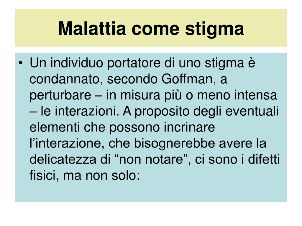 Malattia come stigma • Un individuo portatore di uno stigma è condannato, secondo Goffman, a perturbare – in misura più o meno intensa – le interazioni. A proposito degli eventuali elementi che possono incrinare l’interazione, che bisognerebbe avere la delicatezza di “non notare”, ci sono i difetti fisici, ma non solo: