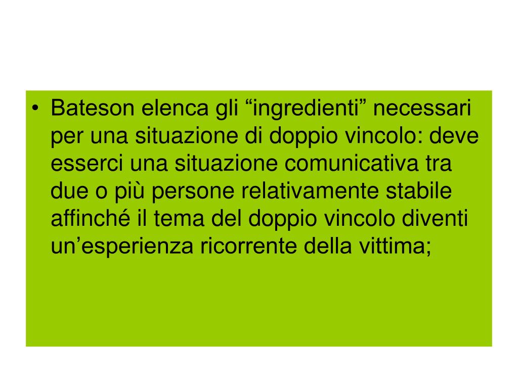 Bateson elenca gli “ingredienti” necessari per una situazione di doppio vincolo: deve esserci una situazione comunicativa tra due o più persone relativamente stabile affinché il tema del doppio vincolo diventi un’esperienza ricorrente della vittima;