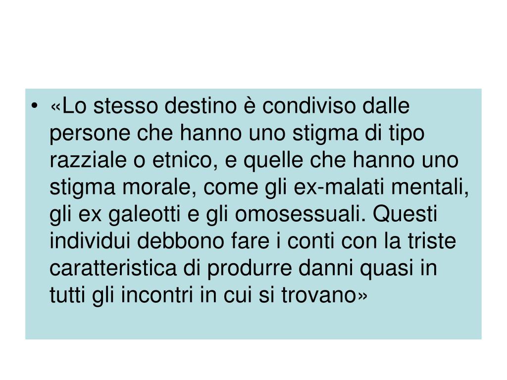 «Lo stesso destino è condiviso dalle persone che hanno uno stigma di tipo razziale o etnico, e quelle che hanno uno stigma morale, come gli ex-malati mentali, gli ex galeotti e gli omosessuali. Questi individui debbono fare i conti con la triste caratteristica di produrre danni quasi in tutti gli incontri in cui si trovano»