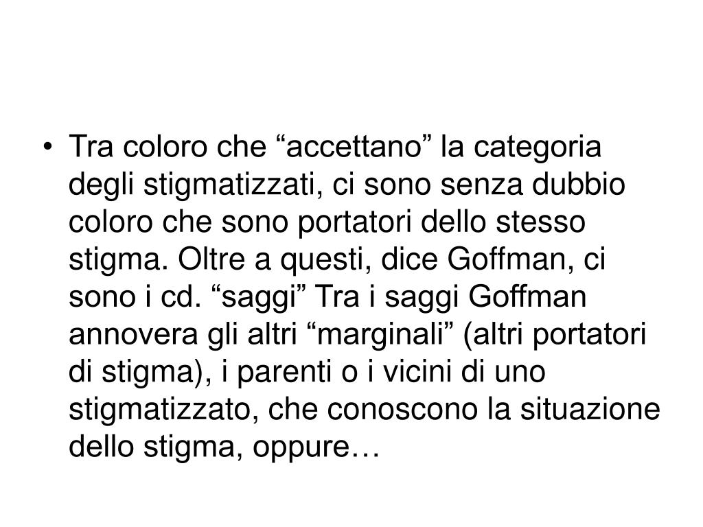 Tra coloro che “accettano” la categoria degli stigmatizzati, ci sono senza dubbio coloro che sono portatori dello stesso stigma. Oltre a questi, dice Goffman, ci sono i cd. “saggi” Tra i saggi Goffman annovera gli altri “marginali” (altri portatori di stigma), i parenti o i vicini di uno stigmatizzato, che conoscono la situazione dello stigma, oppure…