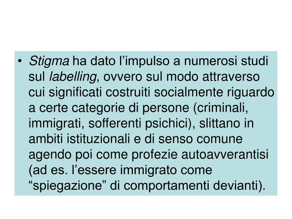 Stigma ha dato l’impulso a numerosi studi sul labelling, ovvero sul modo attraverso cui significati costruiti socialmente riguardo a certe categorie di persone (criminali, immigrati, sofferenti psichici), slittano in ambiti istituzionali e di senso comune agendo poi come profezie autoavverantisi (ad es. l’essere immigrato come “spiegazione” di comportamenti devianti).