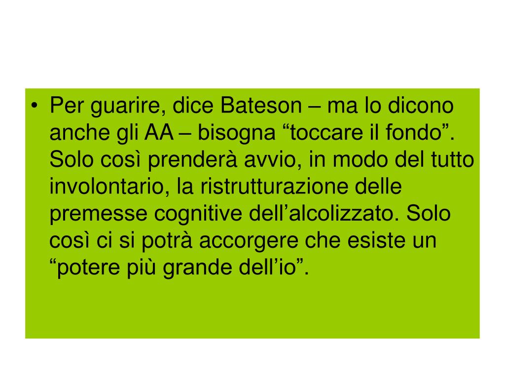 Per guarire, dice Bateson – ma lo dicono anche gli AA – bisogna “toccare il fondo”. Solo così prenderà avvio, in modo del tutto involontario, la ristrutturazione delle premesse cognitive dell’alcolizzato. Solo così ci si potrà accorgere che esiste un “potere più grande dell’io”.