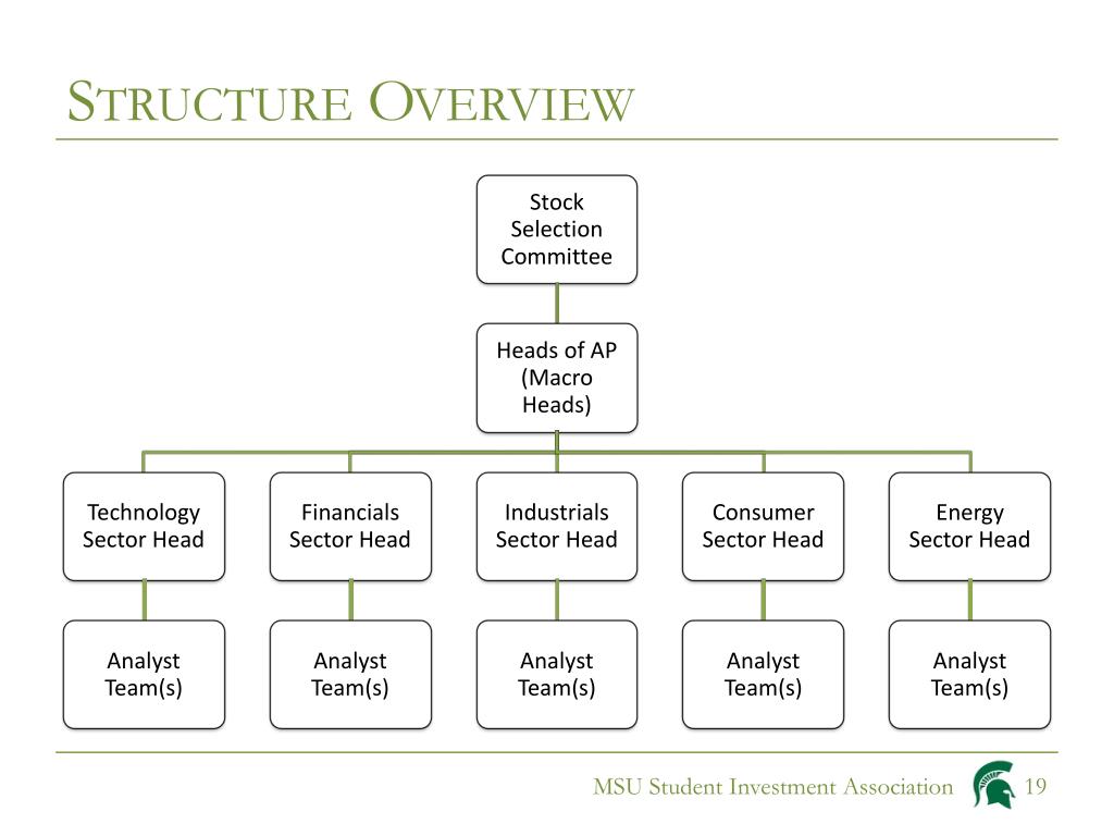 Sector Heads • Understand • Key industry drivers and trends • Fundamental determinants to success • Maintain a close relationship with: • AP Heads: • Sector strategy • Holdings update • Analyst Teams: • Educate and facilitate process • Uphold quality of presentations MSU Student Investment Association